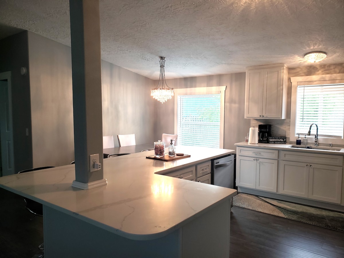 Cozy 1-bedroom/1-bathroom with a large loft that overlooks the main living-space. Downstairs bedroom has a queen bed & ladder accessible loft has a king bed. Perfectly accommodates small groups of 4, not including an additional guest that can make themselves comfortable on the twin pull-out. HUGE deck out front for watching the sunset & grilling the night away! You'll find the pint-sized kitchen equipped with the essentials. Everything is pint-sized including the 4-burner stove and 1/2 fridge.
