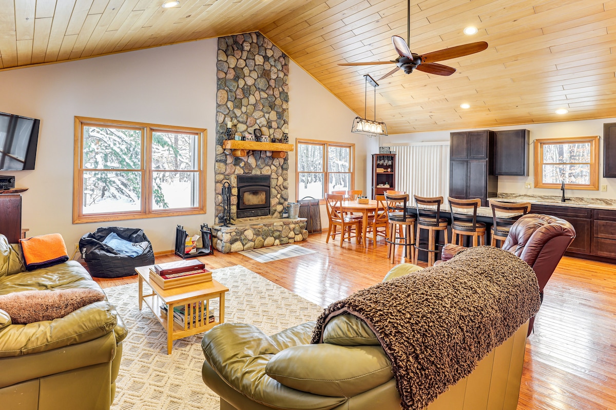 Deze Chalet Cabin A-frame in het bos beschikt over 3 slaapkamers en comfort voor een verblijf van vier seizoenen. De keuken heeft een open concept voor een ruime woonkamer met natuurlijke open haard. Twee volledige badkamers, wasserette op de eerste verdieping, buitenterras en vuurplaats. Rijd rechtstreeks naar sneeuwscooterpaden, 25-30 minuten skiën bij Caberfae & Crystal Mountain, mountainbiken, fietsen op de weg naar Traverse City. Wandelen, kanoën/kajakken en ATV/uTV. Het jachtseizoen is aan de gang, controleer de websites van Michigan voor geautoriseerde omliggende gebieden.
