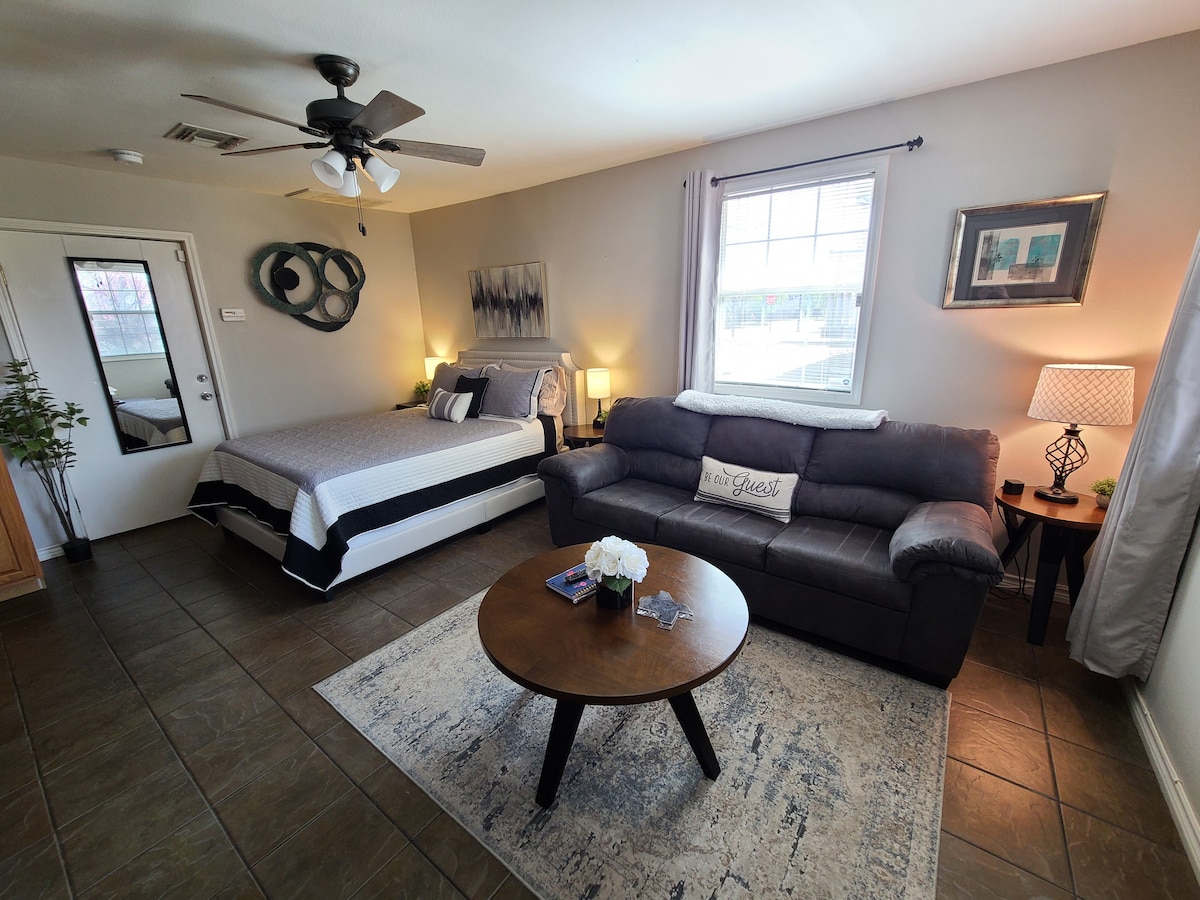 Kom tot rust in onze gezellige privéstudio achter onze hoofdwoning in een rustige historische buurt. De ruimte beschikt over een comfortabel queensize bed, een slaapbank die het meest geschikt is voor een kleine gast of een kind, een 46-inch tv met streaming-apps en een compacte kitchenette voor lichte maaltijden en koffie. Deze studio is het meest geschikt voor soloreizigers of koppels die op zoek zijn naar een rustige, comfortabele accommodatie dicht bij het centrum en lokale restaurants. Ontworpen voor rustige, respectvolle verblijven.