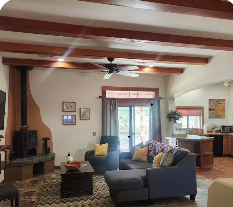 A spacious get-away nestled amidst desert trees in view of the breath taking Dragoon Mountain range. Living room, kitchen, dining room, bathroom and bedroom spaces. 12 foot by 32 foot roofed patio allows for indoor/outdoor living. The only sounds you are likely to hear are those of the coyote and other desert friends. There is a telescope available to view the amazing night skies. We also have a ground set fire pit for roasting marshmallows and enjoying the mountains at night.