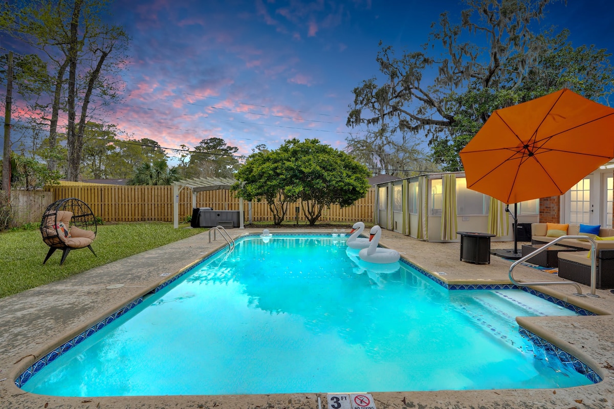 Veel plezier met het hele gezin in onze stijlvolle, gelijkvloerse woning met een zwembad! Maak dit je knooppunt voor je verblijf in Savannah - halverwege tussen Downtown en Tybee Island - je kunt in ongeveer 10 minuten aan beide kanten komen! Verlaat de oprit, ga naar het oosten en kom aan bij North Tybee Beach, of rijd naar het westen om River Street te bereiken, parkeer en verken! Hoogtepunten: - Biljart - Eengezinswoning - 4 slaapkamers - 3 badkamers - 14inch traagschuimmatrassen - Centraal gelegen - Studio McGee decor -cadegames - Parkeer maximaal vier auto's