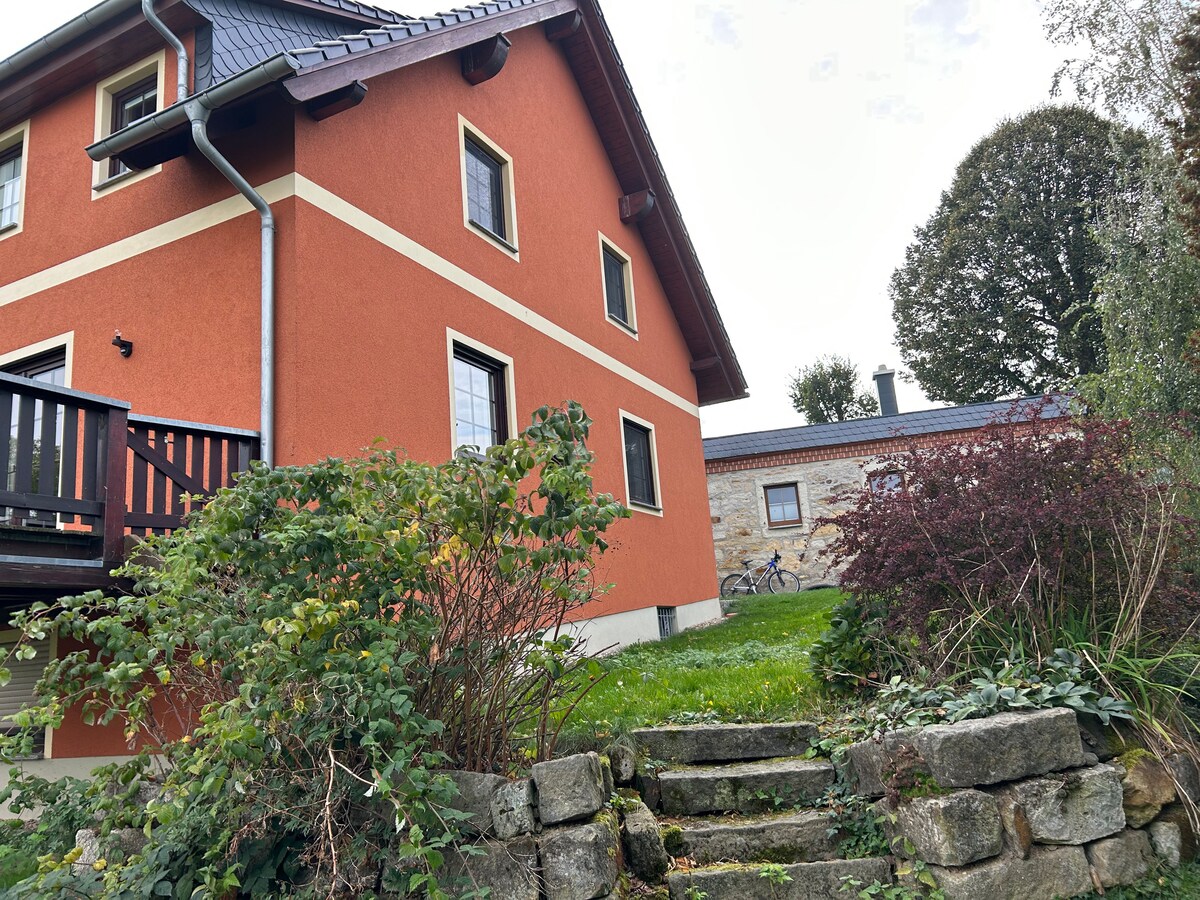 DenTharandter Wald ganau voor de voordeur,dus je woont bij ons! Als je op zoek bent naar afzondering en rust, dan moet je hier zijn!Het appartement (begane grond) voor 2 pers. heeft een aparte opgang. De slaap-woonruimte heeft een boxspringbed, een kledingkast, een fauteuil en een 55 inch tv. De moderne badkamer is naast de deur. De eetkamer biedt een kitchenette. Een eigen parkeerplaats voor u is direct voor het huis op het terrein. Een opslagruimte voor fietsen is mogelijk in de carport.