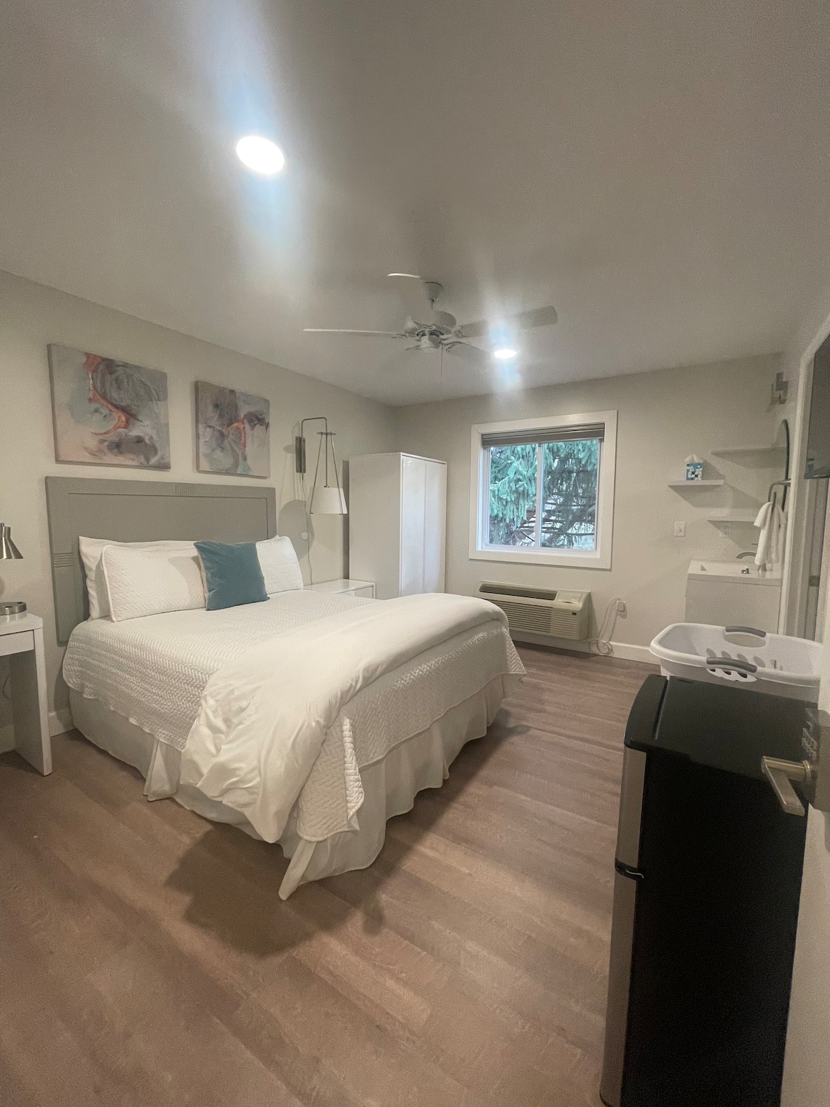 One double bed with a microwave & mini fridge. The room has been updated with flat screen televisions, mini-fridges, microwaves, air-conditioning, and free wi-fi. Many of the rooms have been remodeled to update flooring, plumbing, electrical, and bathroom fixtures.
