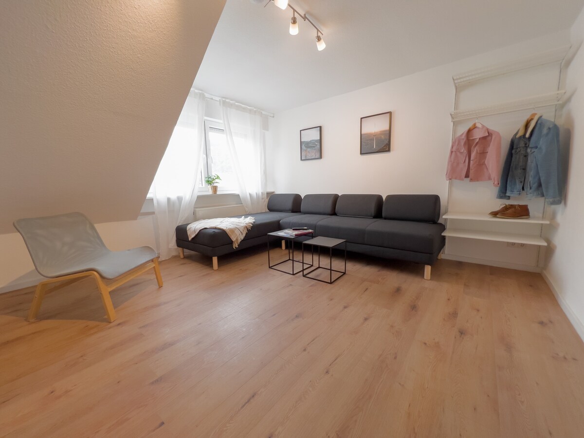 Chique zolderappartement in KO-Karthause! Dit appartement is precies de juiste plek voor JOU als: Je bent een student aan de Universiteit van Koblenz of een stadsreiziger bent (openbaar vervoer om de hoek) die in het stadscentrum wil zijn, maar toch de nieuwe dag wil beginnen in een rustige omgeving, omringd door natuur, of je bent gewoon op zoek naar een ontspannen plek om te verblijven met gratis parkeren om je reis de volgende dag voort te zetten. Welkom!