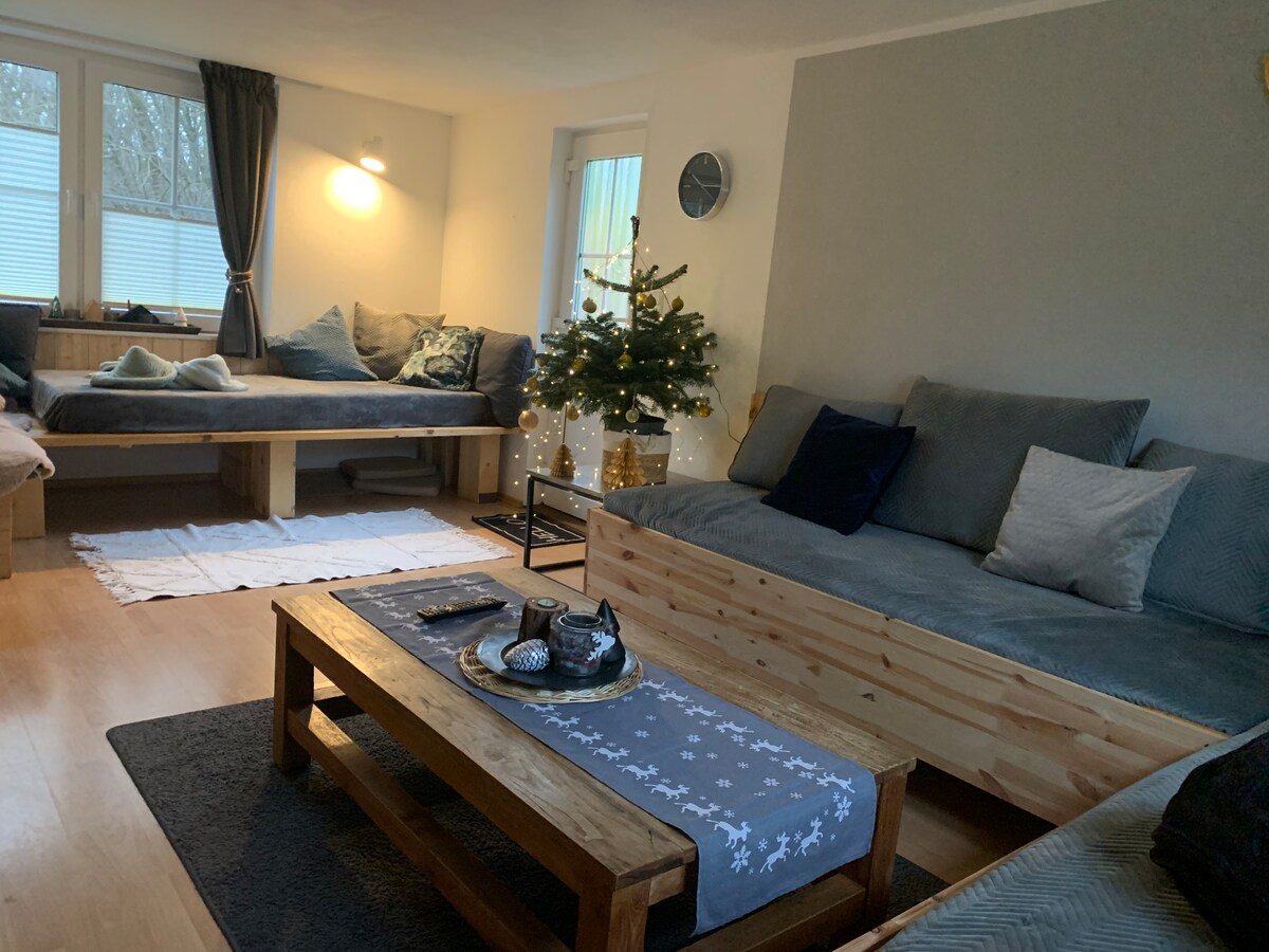 Relax with your family in an old mill from the 15th century situated on the Plausdorf Estate, near Amöneburg and Kirchhain close the old University Town Marburg. There are endless bicycle paths beautiful walks through the surrounding forests and fields. 2 tennis and golf club, indoor and outdoor public swimming pools as well a Horse Riding Farms are close by. In the neighboring town Kirchhain are plenty of restaurants, 7! supermarkets and an Italian Ice Cream Café. Pets are welcome.