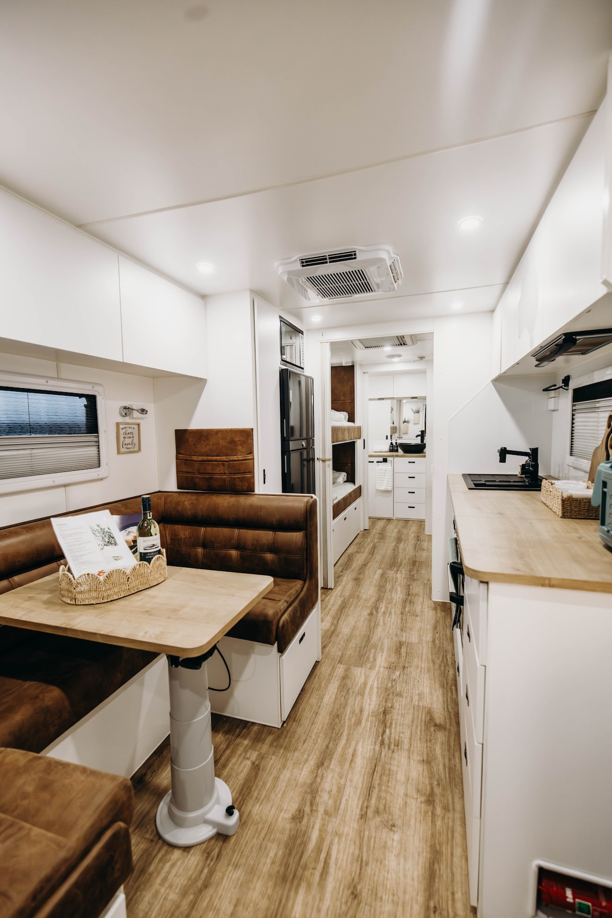 Boundless Campwagon 276 — Boutique Outback Luxury Enjoy a thoughtfully curated outback escape in Winton. This new 7-berth caravan features a modern kitchen, two TVs, comfortable sleeping with 1 queen, 4 quad bunks and a lounge conversion to single. Fully set up and ready for guests, it’s the perfect stylish base to relax and explore the unique charm of the outback.