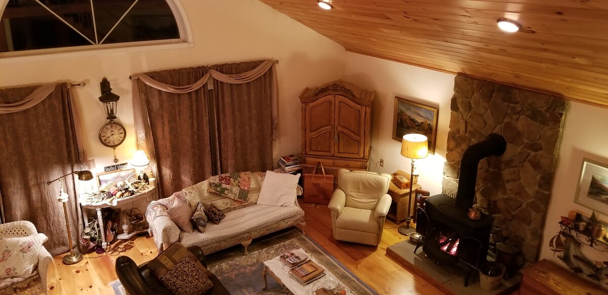 Mooie blokhut gelegen tegenover Woodford Lake met uitzicht. Grote Grote kamer kathedraal plafond, halve maan raam, grenen plafond & vloeren, eettafel,houtkachel, hoek gashaard, volledige keuken. Prachtige sfeer, rustiek maar toch elegant. 2 slaapkamers, volledig bad met klauwvoet bad, romantische slaapzolder met zithoek. Kelder speelruimte verwarmd met 2 bedden voor kinderen. Centrale verwarming, wasmachine/droger TV/Roku, plafondventilatoren. Geweldig uitje voor natuurliefhebbers, skiërs, sneeuwscooters, wandelaars. Wifi.