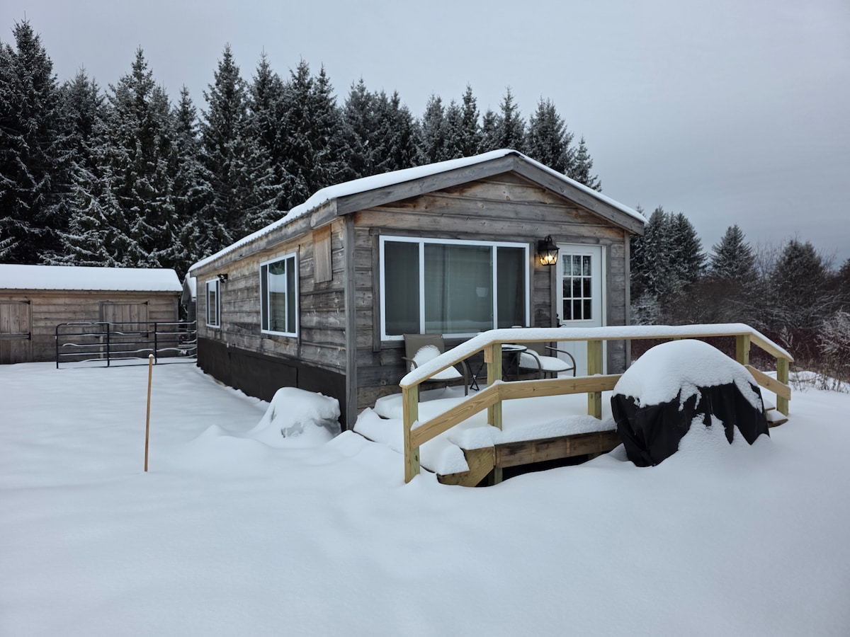 Kom en zie waar Tiny Home living om draait! Dit schattige kleine huisje ligt aan een grote appelboom. Onze rustieke queensize bedhut is een schattig, ontspannend uitje voor twee met een grote afgeschermde veranda. We bevinden ons langs het belangrijkste ATV-pad, gewoon stoppen meteen! Er zijn zevenendertig hectare met wandelpaden en Big Brook grenst aan de ene kant van het pand. Geniet van ons uitje naar Noord-Maine!