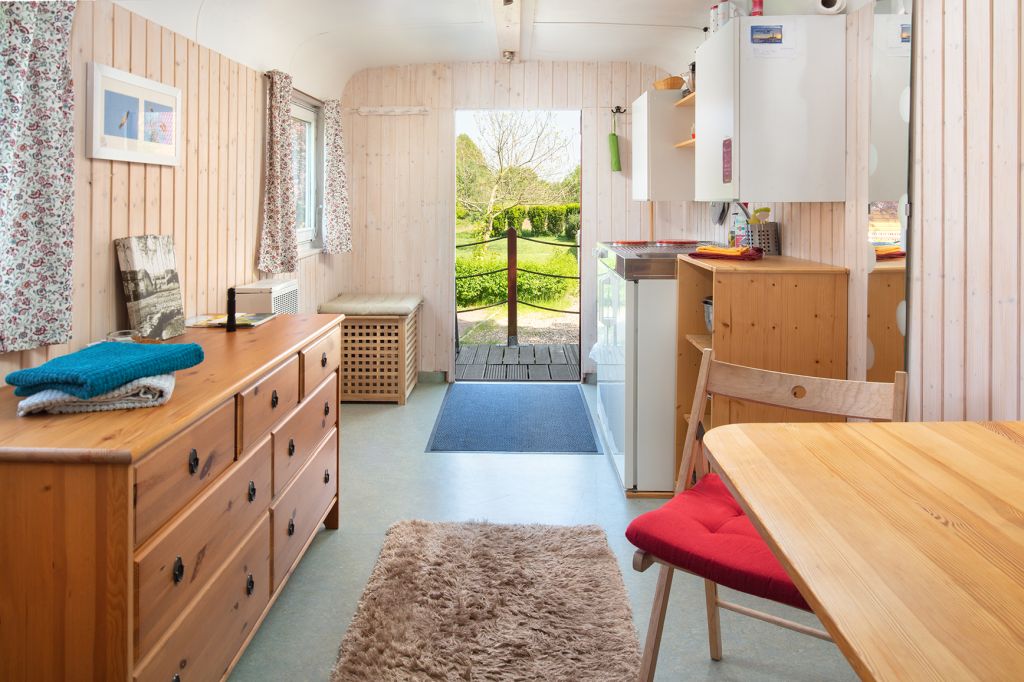 De ca. 18 m ² grote bouwwagen biedt een gezellige overnachtingsplek voor maximaal twee personen in een 1.40 m breed slaapbed in zowel de zomer als de winter. In de wagen bevindt zich een uitgeruste pantrykeuken met 2-pits fornuis, een koelkast en warm water. Het bed is ongeveer 140 x 200 cm met een paar centimeter 'lucht' aan het hoofd- en voetuiteinde. Naast de trailer is er een geurneutraal composttoilet. De badkamer is in ons huis en moet met ons worden gedeeld.