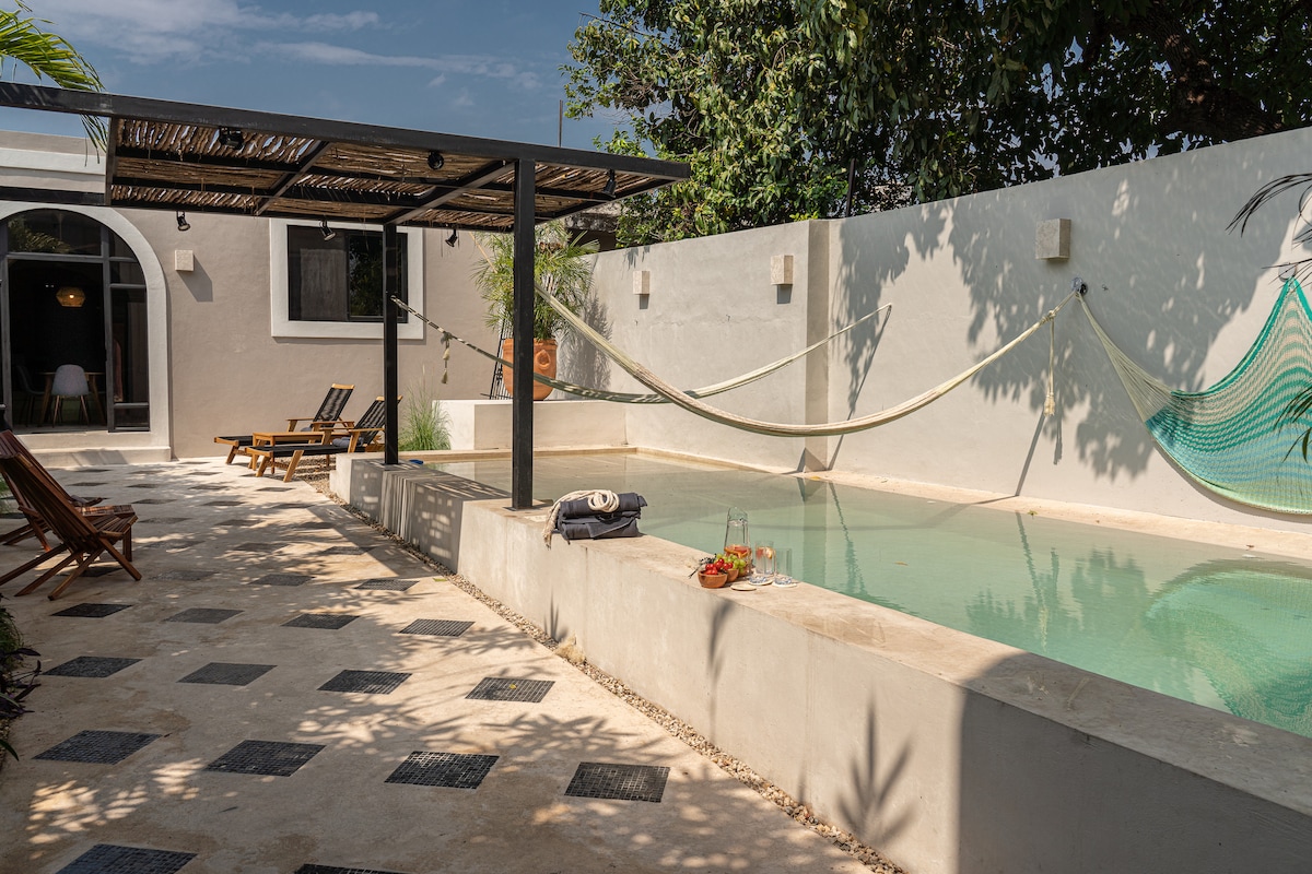 Ruim appartement in koloniaal huis, perfect voor 2. Gelegen ten oosten van het centrum van Mérida, vlakbij de wijk ChemBech, op slechts 20 minuten lopen van het centrale plein. Het verwelkomt reizigers die rust en introspectie zoeken. Uniek in stijl en design, met luxe afwerkingen, garandeert het privacy weg van de drukte in het centrum. Het appartement is volledig privé, op de benedenverdieping. Het heeft een volledig uitgeruste keuken en woonkamer, een zwembad, een tuin, een terras, een kingsize slaapkamer met een marmeren badkamer.