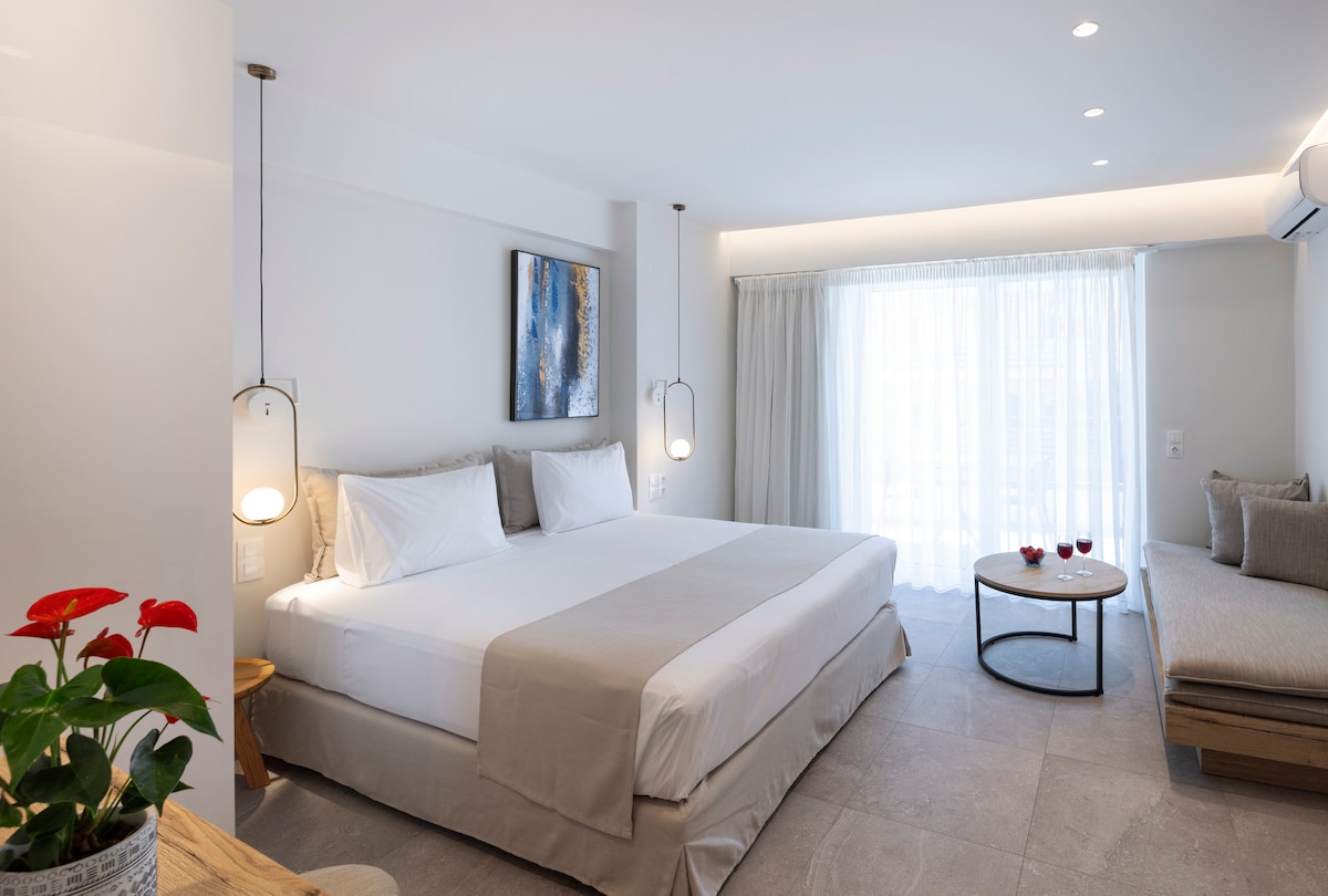 Junior suite Calmare is perfect gelegen in het hart van alles wat Rethymno te bieden heeft! Het verwelkomt gasten voor een ervaring die voortdurend evolueert naar de wensen van de moderne reiziger. Het is volledig vernieuwd, schoon en veilig, volgens alle nieuwe instructies en gezondheidsprotocollen. Het 'Health First' -certificeringszegel van het Ministerie van Toerisme, wat aangeeft dat de onderneming voldoet aan alle gezondheidsprotocollen. Het hele jaar geopend. MITT Αριθμός Γνωστοίησης: 1122245