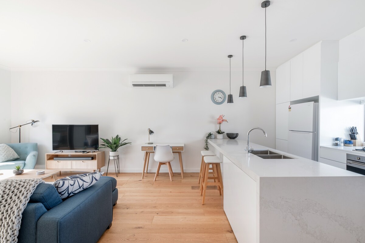 🌟 "We waren verbijsterd over hoe schoon en vlekkeloos het appartement is" Ontspan in deze moderne Japans-Scandinavische designwoning met twee slaapkamers terwijl je Melbourne verkent. Onze woning is gelegen in het Art Precinct van Melbourne en biedt een schilderachtig uitzicht op de skyline van de stad. Bovendien ligt de woning op loopafstand van trams/treinen, het Crown Casino, de NGV, het Arts Centre en de Royal Botanical Gardens. Neem direct beneden een tram naar de CBD, het MCG, AAMI Park en Melbourne Park voor de Australian Open.