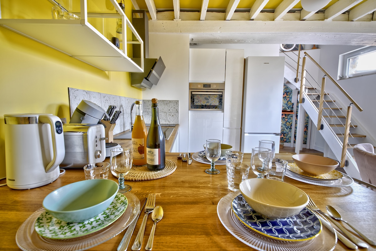 De ruimte Het appartement is 2 verdiepingen met 2 slaapkamers op een rij. Ideaal voor een stel met kinderen. Toegang is via een externe trap die leidt naar een terras met uitzicht op de privétuin met uitzicht op de St Denis-kerk. Het appartement heeft op de eerste verdieping een ruime woonkamer met een eethoek naast de Amerikaanse keuken, een woonkamer met een houtkachel, een doucheruimte en een apart toilet. Een interne trap bedient boven twee slaapkamers op rij.