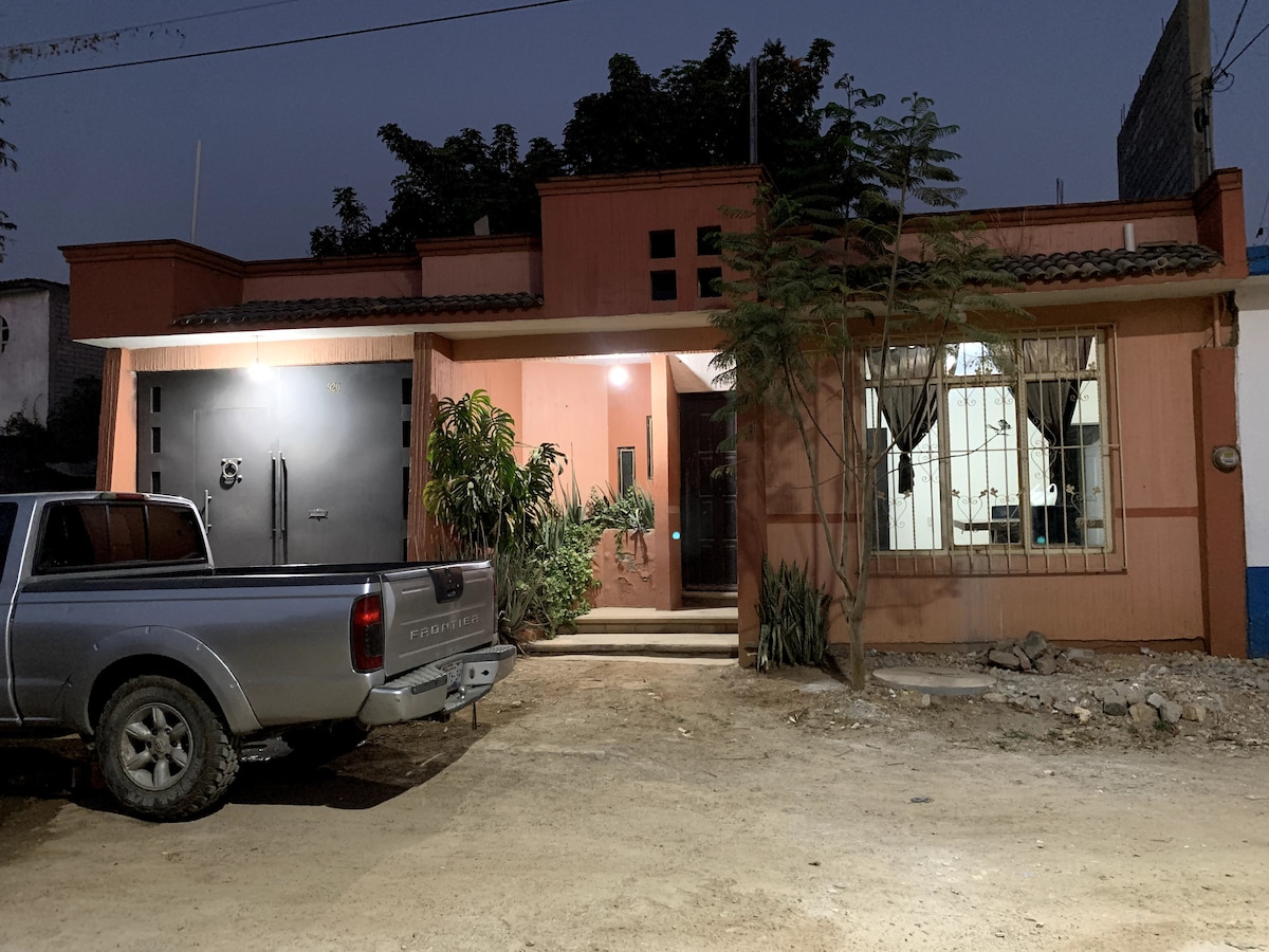 Gelegen op 5 minuten van de luchthaven van Oaxaca, 15 minuten van het centrum, 10 minuten naar winkelcentra. Ambachtelijke tour en op 50 meter van de weg naar Huatulco en Puerto Escondido. Het heeft groene rustplaatsen, parkeergelegenheid voor 5 auto 's, elke kamer heeft directe toegang tot tuinen. Uitgeruste keuken (koffiezetapparaat, blender, elektrische grill, bestek). Een enkele verdieping, ventilatoren in kamers en woonkamer. Huisdiervriendelijk.