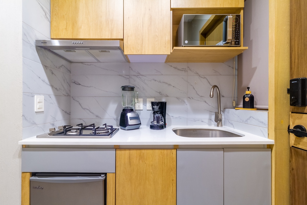 MORADA LIVING Gezellige en functionele studio voor reizigers die op zoek zijn naar comfort en locatie. Deze ruimte heeft een queensize bed, slaapbank, uitgeruste keuken, smart-tv en bureau, ideaal voor een thuiskantoor. Het gebouw biedt moderne gemeenschappelijke ruimtes en een rustige sfeer om te rusten of te werken. Gelegen in Colonia Moderna, ben je op enkele minuten van het historische centrum, Colonia Americana en Agua Azul Park. Een praktische en comfortabele optie voor je verblijf in Guadalajara. We kijken ernaar uit om je te verwelkomen!