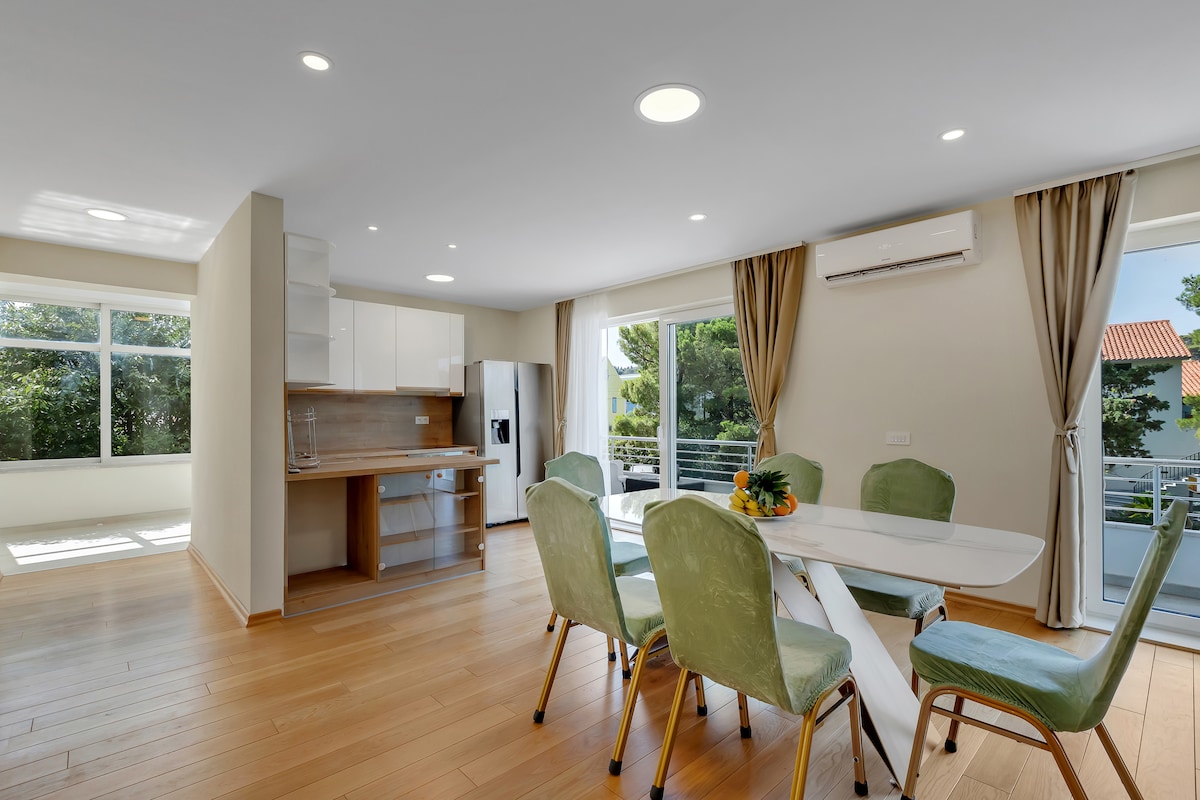 Bright and welcoming, KALINA is located in a quiet residential area. Only a few minutes' walk down into the town, our location enables incredible views overlooking the Adriatic, mountains, and the city. The sandy beach is just a short walk from the apartment, making Kalina an excellent spot for a family vacation.