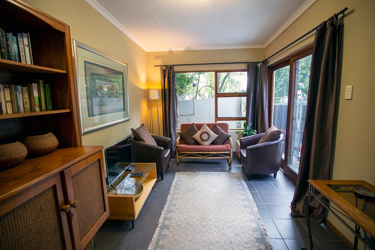 Rustige oase in het hart van een van de oudste en veiligste buitenwijken van Johannesburg met eigen ingang, off-street parkeren, bewaker, back-up water en elektriciteitssystemen. We hebben net een gloednieuwe keuken en badkamer geplaatst! Verwacht beddengoed van hoge kwaliteit, stijlvolle meubels, lekkernijen en verse bloemen. Al deze hebben een premie, maar onze gasten die ons consequent vijf sterren hebben gescoord denken dat het de moeite waard is! Het huisje is volledig zelfstandig met alles wat je nodig hebt voor een lang of kort verblijf.